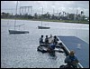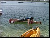 The CI Team (my group), designed a very nice raft complete with sail and everything. The smallest team member, Anand, got on the raft, with Colin pushing from behind. The team got hampered by timing, as the wind died exactly when they began their run! They compensated by using more pushers. Their raft was able to eventually hold the weight of two members.